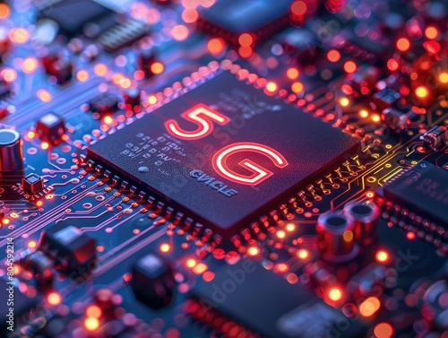 Closeup of a 5G chipset embedded in a smartphone, highlighting the technological advancements that enable faster mobile communications, high resolution DSLR