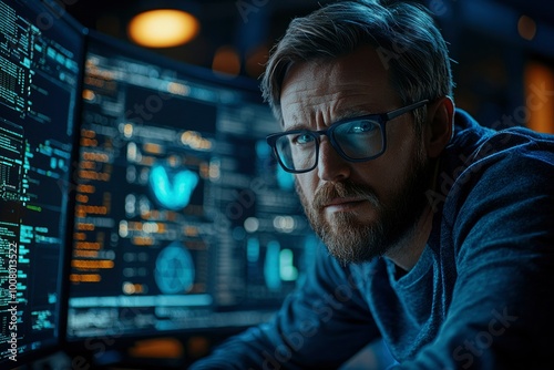 Close-up of a Bearded Man Wearing Glasses and Looking at a Computer Screen