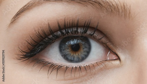 Close-up of a beautiful eye with intricate details and long lashes on a soft background