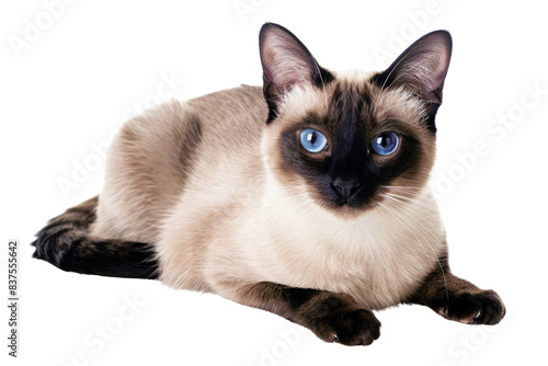 Close-up of a beautiful Siamese cat with striking blue eyes, lying down and looking directly at the camera against a white background.