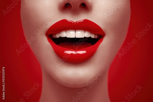 Close-up of a beautiful woman's red, glossy lips and perfect white teeth. The image is striking against a red background.