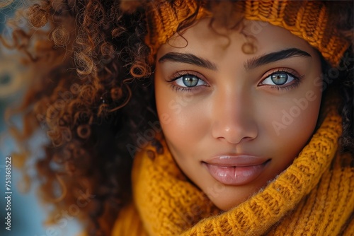 Close-up of a beautiful young woman with stunning blue eyes and curly hair wearing a mustard yellow knit hat and scarf
