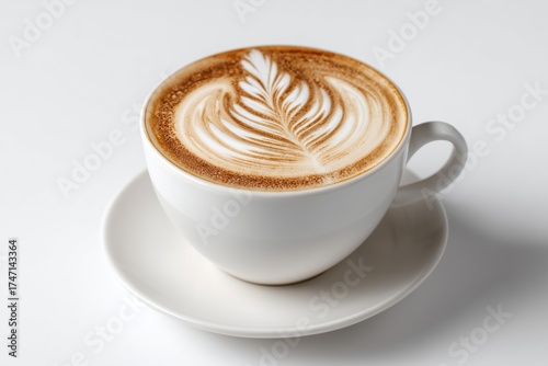 Close-up of a beautifully crafted latte with leaf design in a white cup on a saucer