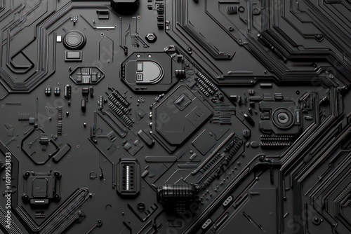 Close-up of a black computer motherboard with various electronic components and intricate circuit patterns, evoking a sense of complexity and high technology