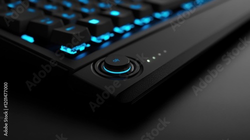 Close-up of a black gaming keyboard with blue LED backlit keys and power button.