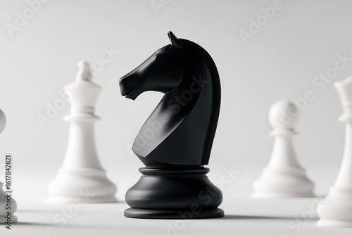 Close-up of a Black Knight Chess Piece Strategically Positioned on a Chessboard with White Pieces in the Background for Board Game and Strategy Concept
