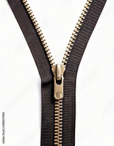 Close-up of a black zipper with gold teeth, showcasing its intricate design and function.