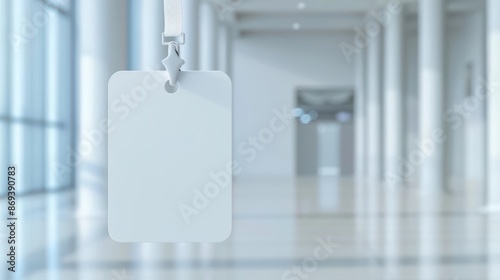 Close-up of a blank identification card hanging on a lanyard in a modern, bright hallway with columns and large windows, perfect for business use.