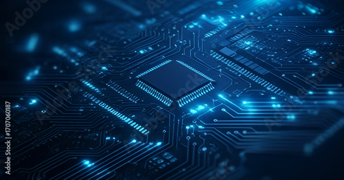 Close-up of a blue computer chip with circuit board patterns, shimmering connections, and intricate details that showcase the sophistication of digital hardware.
