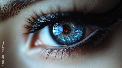 Close-up of a blue eye with a digital reflection and a red checkmark.