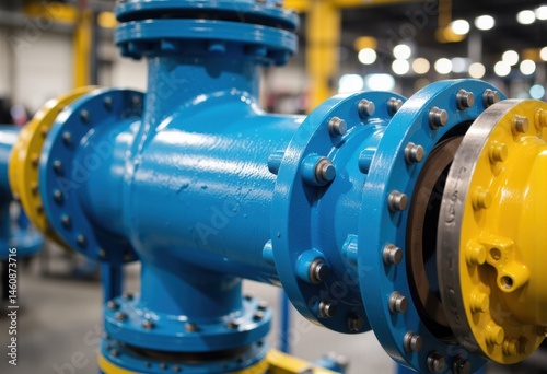 Close-up of a blue industrial pipe with yellow flanges and bolts