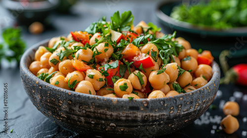 Close-up of a bowl filled with a chickpea salad, featuring chopped parsley, red pepper, and chickpeas