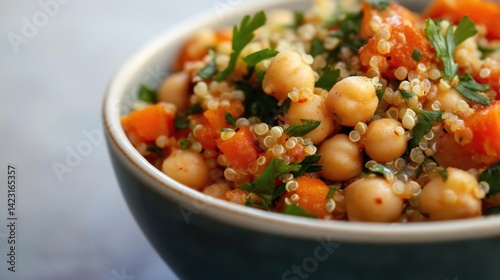 Close-up of a bowl of salad. the bowl is made of ceramic and is sitting on a white surface. the salad is made up of small, round, white chickpeas, diced carrots, and quinoa.