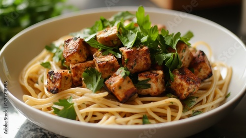 Close-up of a bowl of spaghetti topped with pan-fried tofu and fresh parsley.
