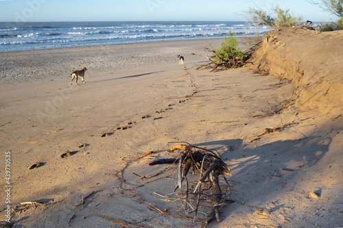 close-up of a branch on the shore of a beach and in the background a couple of dogs leaving their tracks in the sand