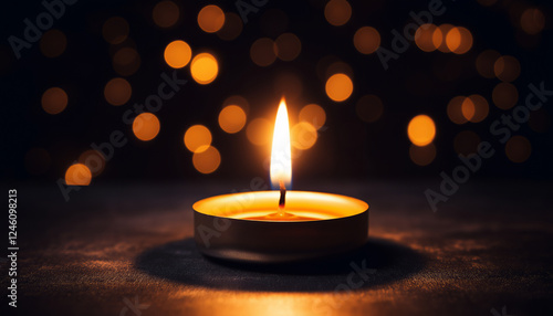 Close-Up of a Burning Candle with Warm Glow and Soft Bokeh Lights in a Peaceful Nighttime Setting