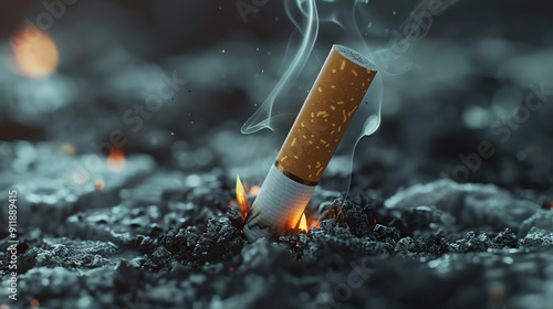 Close-up of a burning cigarette in an ashtray, it's smoke curling ominously, symbolizing the dangers of tobacco addiction and its potential health consequences
