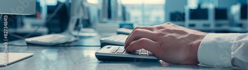Close-up of a businessman's hands typing on a calculator while sitting at his desk in an office.