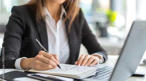 Closeup of a businesswoman's hand writing in a notebook at a desk in an office.