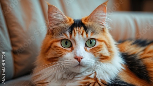 Close-up of a calico cat with green eyes resting on a sofa. Feline portrait with detailed fur and an attentive expression. Cozy home setting.