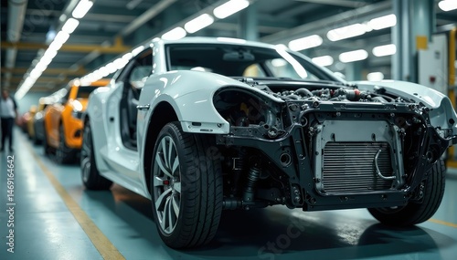 Close-up of a car chassis undergoing construction in a factory , factory setting, process, industrial production
