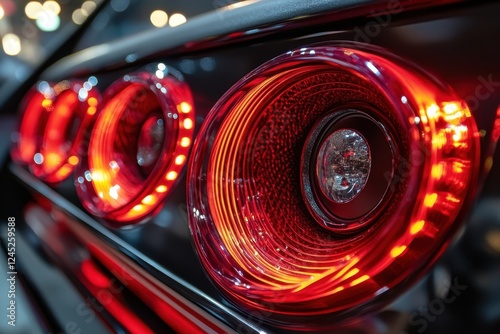 Close-up of a car's illuminated rear lights. Showcase automotive design and technology, ideal for transportation themes.