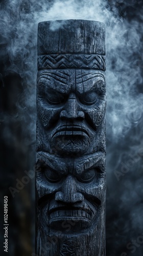 Close-up of a carved wooden totem with eerie faces, set against a shadowy, mist-filled background with soft, dramatic lighting, Copy space, happy Halloween special background, haunted decor