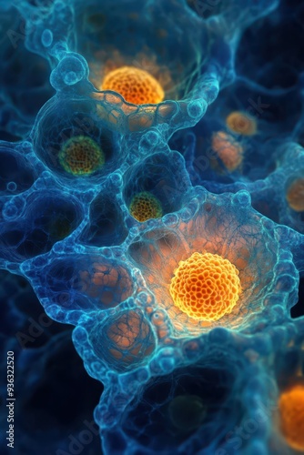 Closeup of a cells nucleus, highlighting the chromatin and nucleolus within the nuclear envelope