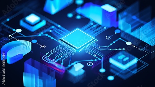 Close-up of a central computer processor with glowing blue circuits and data blocks technology chip