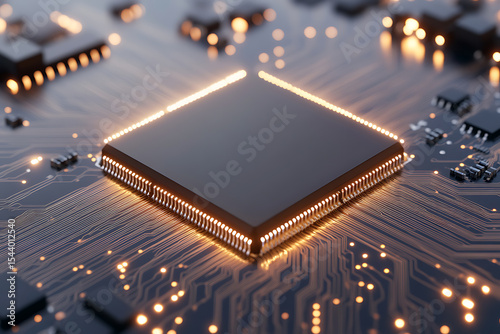 Close-up of a central processing unit (CPU) chip on a motherboard, highlighting the intricate circuitry and connectivity. High-tech computing component.
