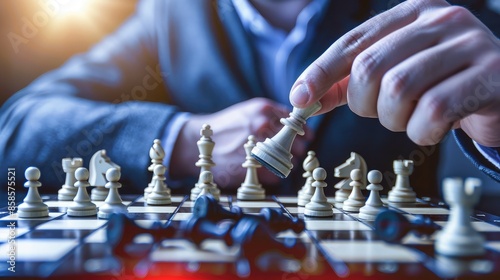 Close-up of a chessboard with strategic moves being made, symbolizing business strategy and decision-making