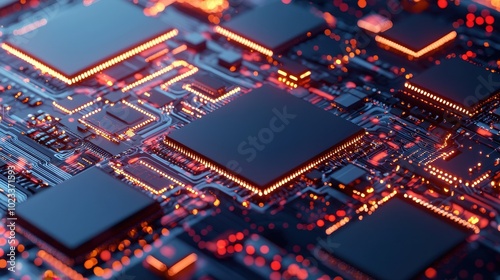 Close-up of a circuit board showcasing intricate electronic components and illuminated pathways, highlighting technology and innovation.