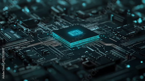 Close-up of a Circuit Board with a Black Chip and Blue Patterns