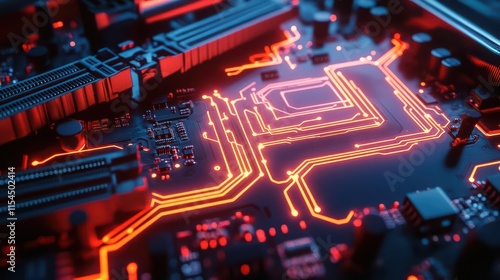 Close-up of a circuit board with glowing red pathways and components.