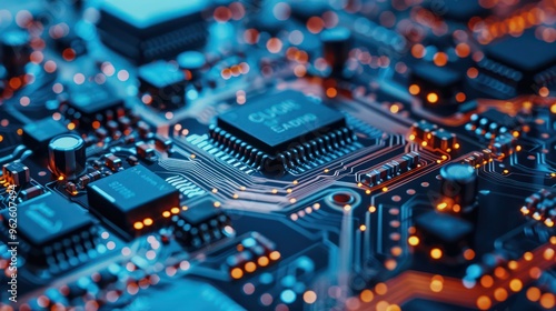 Close-up of a circuit board with intricate patterns and glowing components, showcasing technology and design.
