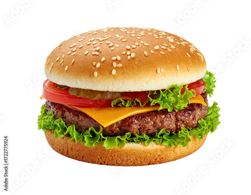 Close-up of a classic cheeseburger on a sesame seed bun, with lettuce, tomato, and cheese