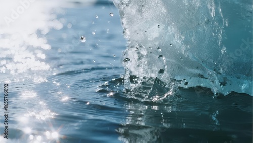 Close-up of a clear water droplet falling into a pristine lake, symbolizing purification and natural filtration. Fresh and clean water concept, environmental conservation and sustainability.