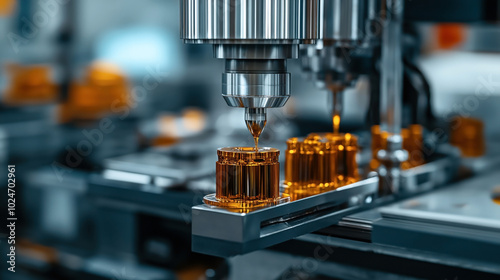 Close-up of a CNC machining process with a drill cutting into metal parts on an assembly line in a factory setting, showing precision engineering and manufacturing.
