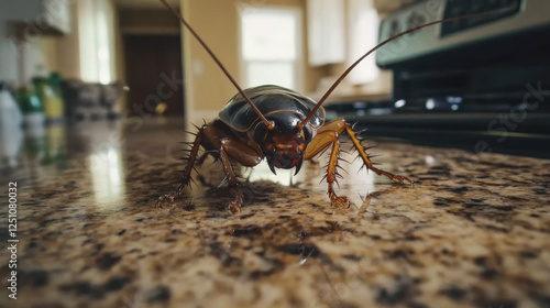 Close-Up of a Cockroach Crawling on a Marble Kitchen Countertop in an Uncluttered Domestic Environment with Soft Natural Light