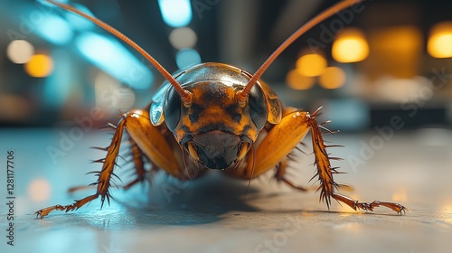 Close-up of a cockroach on a shiny surface in a modern kitchen setting with blurred lights