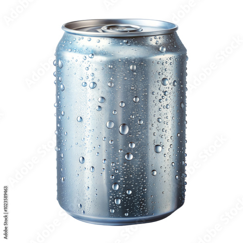 Close-up of a cold, refreshing soda can with droplets, isolated on transparent or white background.