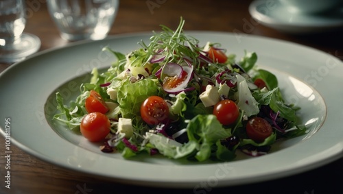 Close-up of a colorful salad plate on a dining table, focused on fresh ingredients