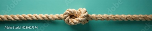Closeup of a complex beige rope knot forming a noose; teal backdrop , woven, material