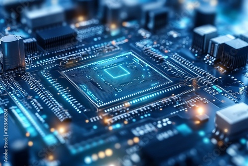 Close-up of a complex circuit board with glowing central processor