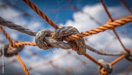 Close-up of a complex knot in interwoven ropes against a backdrop of a partly cloudy sky