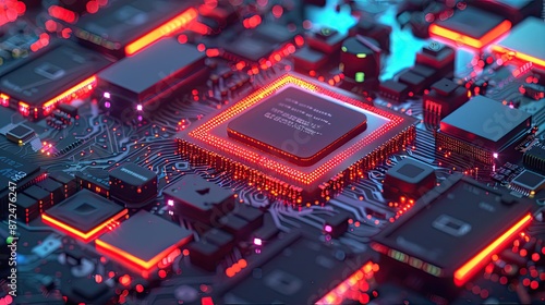 Close-up of a Computer Motherboard with Glowing Red LEDs
