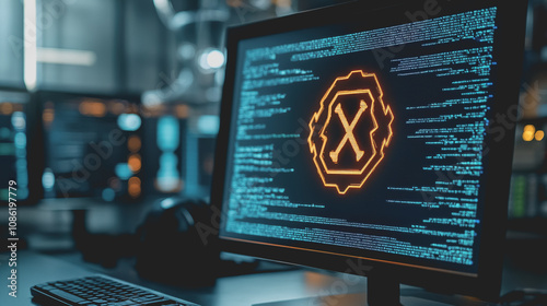 Close-up of a Computer Screen Displaying a Warning Message in a High-Tech Environment, Featuring Neon Blue and Orange Graphics with Digital Code