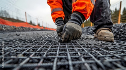 Closeup of a construction worker inspecting and repairing geogrid materials ensuring proper installation and performance.