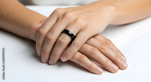 Close-up of a couple holding hands with one wearing a black wedding band symbolizing love commitment and unity in a romantic relationship on a white background