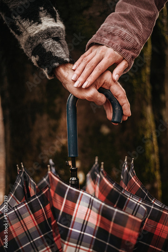 Close-up of a couple's hands intertwined on a closed umbrella